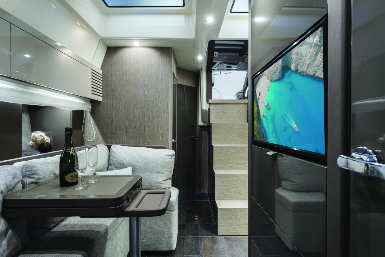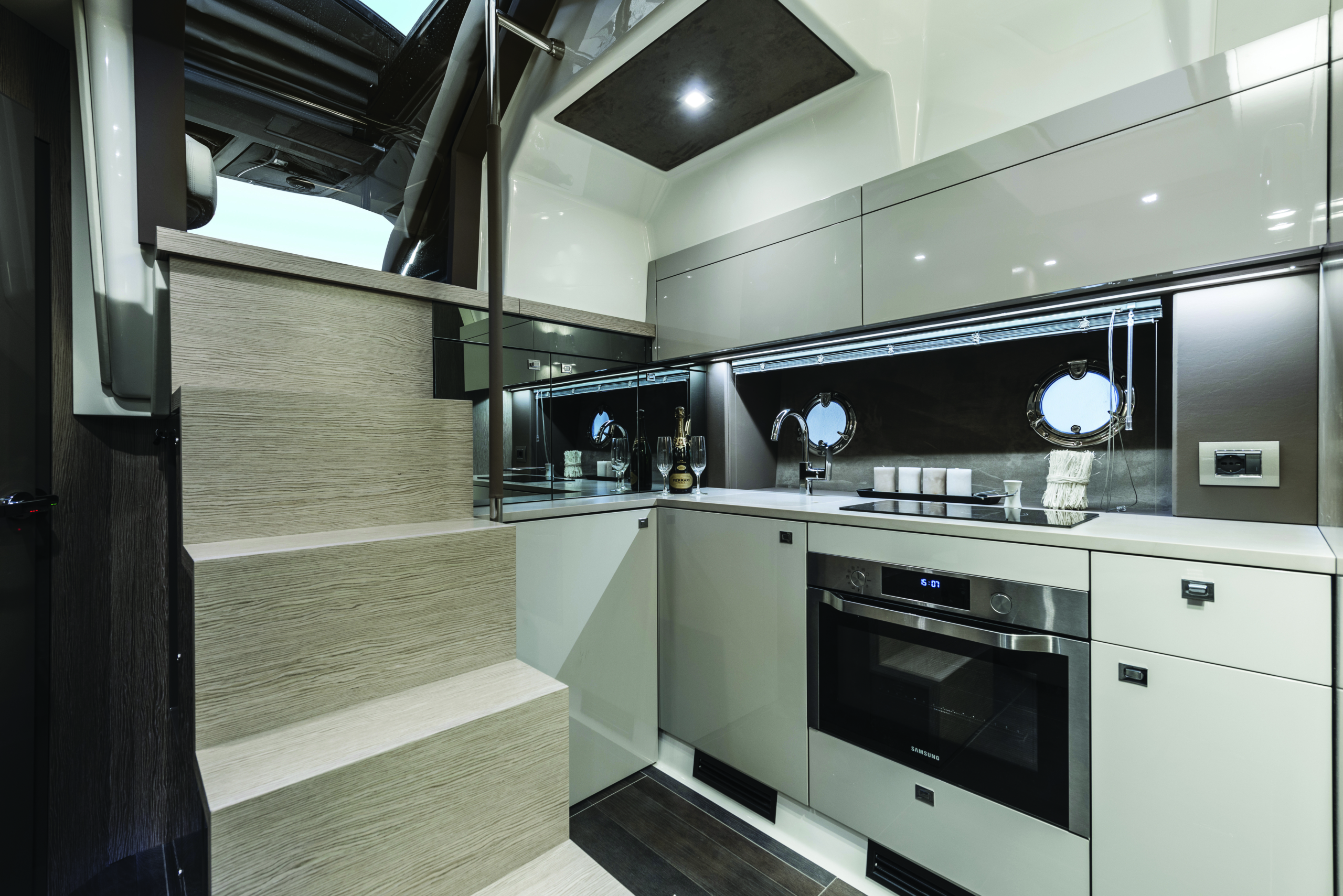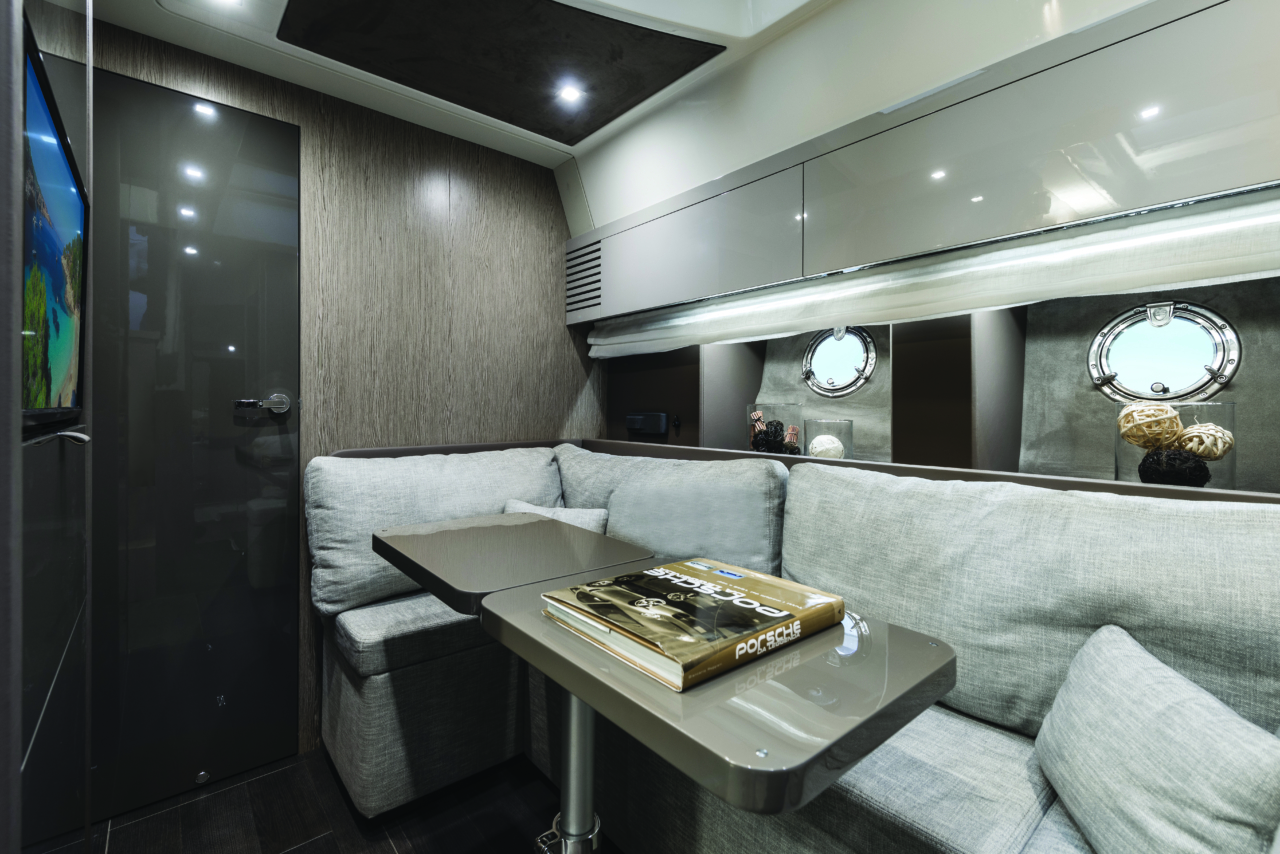 Het ruime zwemplateau achteraan is een droom om van te duiken, bovendien kunnen we het zwemplatform hydraulisch zakken om vb een jetski of tender gemakkelijk in de garage op te bergen. De comfortabele C vormige bank achteraan is perfect om te vertoeven met het zicht op het water, bovendien is er ook een ruim zonnedek waar men kan zonnebaden. In de kitchenette is een koelkast, grill en afwasbak voorzien zodat u alles bij de hand hebt. De kapitein heeft een overzichtelijk dashboard met knoppen op het stuurwiel om snel alles te kunnen bedienen. De boot is standaards voorzien van een joystick systeem wat aanmeren een achter droom maakt. Als het weer het toelaat kunnen we de soft top elektrisch openen om een ruime gevoel te creëren en wat zonlicht in de cockpit te laten? Dit kan ook fantastisch zijn om s ‘avonds te genieten onder te prachtige sterrenhemel.