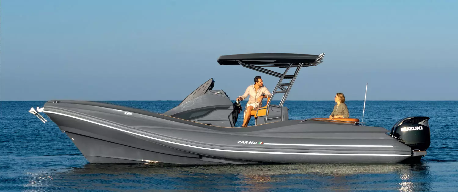 Op zoek naar een Rib met fantastische vaareigenschappen en een prachtig Italiaans design? Dan is de Zar 95 SL zeker iets voor u! Deze boot is 9.6m lang en 3m30 breed. Achteraan de boot is een heel grote U- bank met tal van opbergruimte onder de zitvlakken. De tafel kan u laten zakken om een groot zonnedek te maken. Er is zelf een ruime bimini top die schaduw biedt van achteraan de boot tot aan het windscherm. Voor de U-bank is een keukeneiland voorzien met gasfornuis, snijplank, afwasbakje en koelkast. Dit alles is heel gemakkelijk toegankelijk en zorgt voor een onvergetelijke tijd op het water. De bestuurder heeft een zeer comfortabele stoel die zittend en staand gebruikt kan worden en voldoende steun biedt in scherpe bochten. In de cabine is slaapplaats voor 2 personen en is voorzien van een apart toilet. In de boeg van de boot is nog een gezellige rondzit die voorzien kan worden van een tafel en ook omgetoverd kan worden tot gigantisch ligbed. Onder ieder luik is ongelofelijk veel opbergruimte en doorgeen de boot zijn overal handgrepen die ons een veilig gevoel geven als we rondlopen in de boot. Deze boot wordt minimaal voorzien van 1x 350pk of maximaal 2x 350pk.
