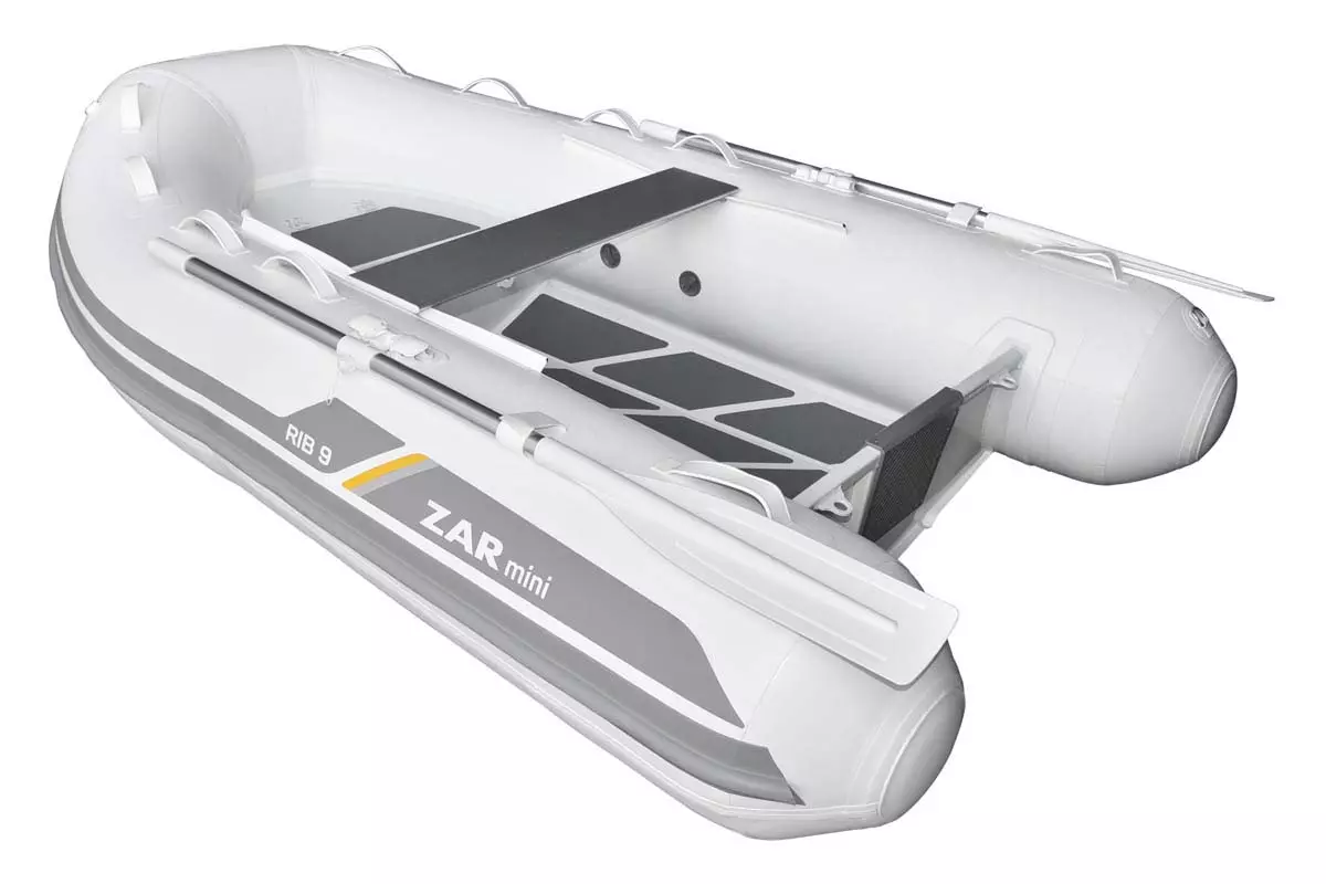 Op zoek naar een kwalitatieve rubberboot met vaste bodem? Dan is de Zar Mini Rib 9 zeker iets voor u! Hij is 2m70lang, 1m71 breed en weegt slechts 59kg waardoor deze boot gemakkelijk hanteerbaar is. De Zar Mini Rib serie is voorzien van een vaste aluminium kiel waardoor deze boot steeds op trailer moet vervoerd worden maar een stuk steviger is en de beste vaareigenschappen heeft. Door het lichte gewicht van de boot wordt deze boot ook vaak gebruikt als bijboot of tender. Alles is heel gemakkelijk in gebruik, u hoeft enkel de tubes op te blazen en de boot is klaar voor gebruik. Een Zar mini is standaard steeds voorzien van een overdrukventiel waardoor u de druk in de tubes nooit te hoog kan worden als we hem in de zon laten liggen. De zitbank is standaard bijgeleverd en kan u verschuiven om de ideale positie te bepalen. Met de standaard bijgeleverde roeispanen kan u zalig roeien op kanalen of rivieren en plaatsen ontdekken die alleen toegankelijk zijn per boot. Als u toch wat verdere trips wil maken dan raden wij een buitenboordmotor of elektromotor aan. Deze boot is verkrijgbaar in de Zar mini Rib 9Lite versie en de Zar mini rib 9 DL versie. De Lite versie heeft een v vormige vloer in de boot en is een stuk lichter (39kg) en de DL versie heeft een vlakke vloer met opberglocker vooraan. Bovendien is het mogelijk om in de DL versie een console te monteren.